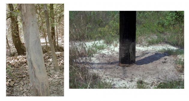 Figure 6. Feral hog rubs on a tree (left) and a telephone pole (right).